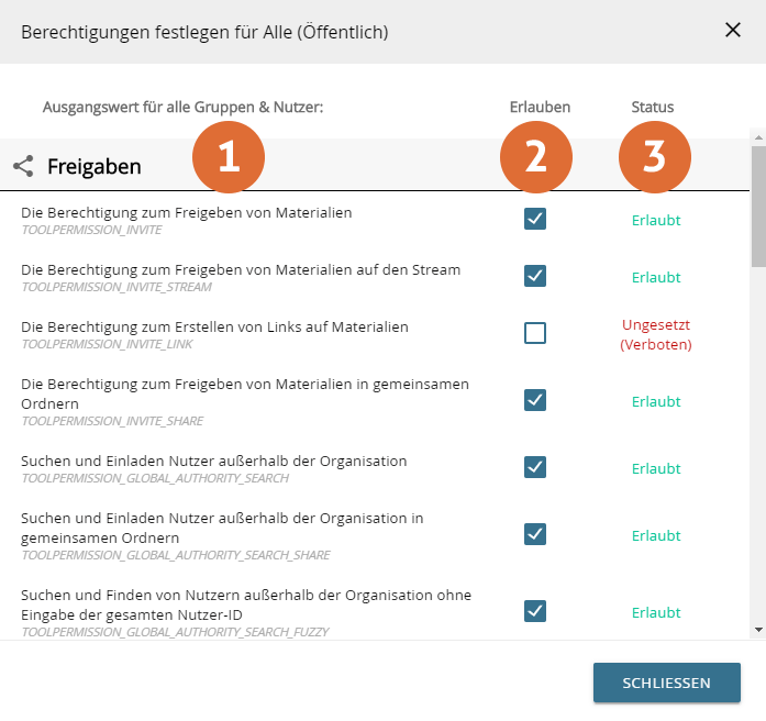 - Die Berechtigung zum Freigeben von Materialien an alle Nutzer / Erlaubt die Nutzung der entsprechenden Schaltfläche in der Maske zum Einladen von Nutzern