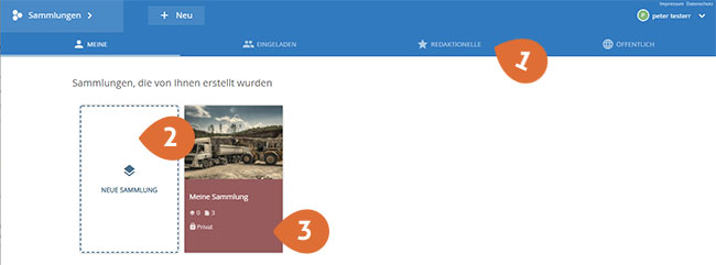 - Sammlungs-Typen-Navigation - Schalten Sie zwischen selbst erstellten Sammlungen (MEINE), für Sie oder Ihre Gruppen freigegebene Sammlungen (EINGELADEN), Redaktionellen Sammlungen oder für alle Nutzer sichtbaren Sammlungen (ÖFFENTLICH) um.