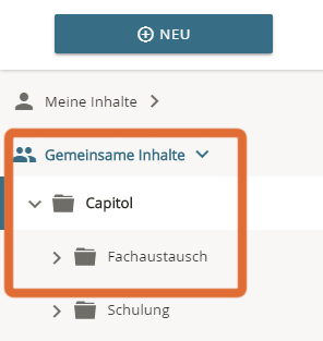 Die Organisations-Ordner finden Sie direkt unterhalb des Knotens "Gemeinsame Inhalte". Nutzer, die mehren Organisationen angehören (z.B. ein Lehrer, der an zwei Schulen unterrichtet) findet dort zwei oder mehr Organisationsordner.