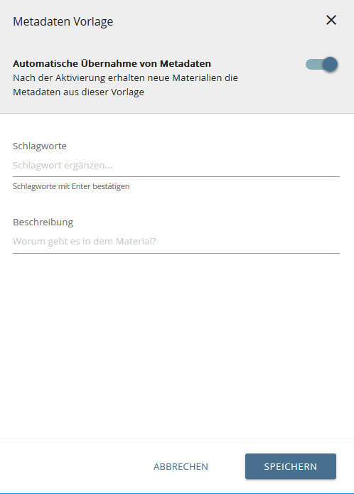 Es öffnet sich ein Fenster, in dem Sie die zu vererbenden Metadaten eingeben können. Der Schalter zur Aktivierung der Vererbung ist standardmäßig eingeschaltet.