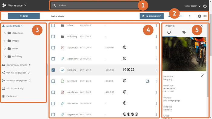 Die Oberfläche des edu-sharing Workspace besteht aus vier Bereichen: