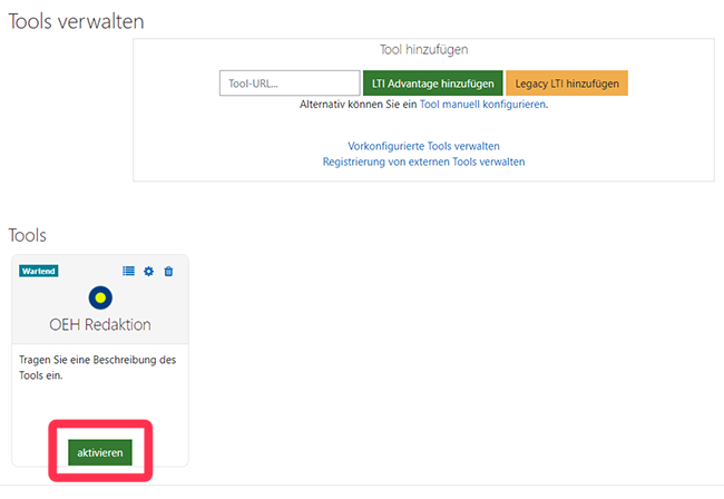 Fügen Sie die URL aus Ihrer Zwischenablage in das entsprechende Feld ein und klicken Sie auf "LTI-Advantage hinzufügen".