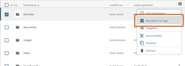 Um die Vererbung für den Ordner zu bearbeiten, wählen Sie wieder die Option "Metadaten Vorlage" im Kontextmenü und nehmen Sie die Änderungen vor.