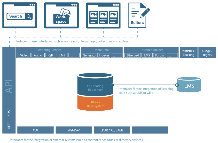 Über die edu-sharing REST API können weitere Applikationen an das Repositorium angeschlossen werden.