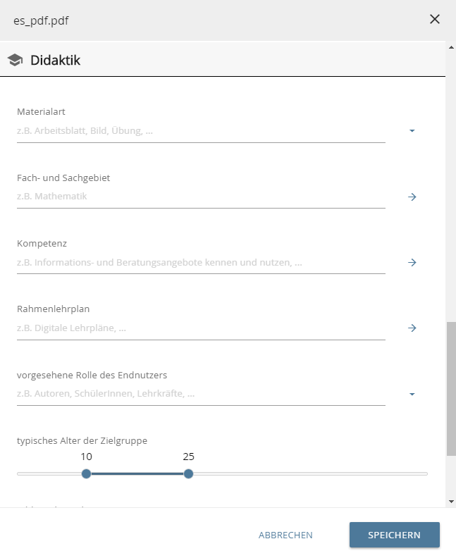 Maske zur Eingabe didaktischer Metadaten im Schulbereich, RLP