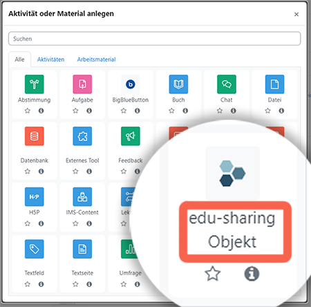 Nach der Integration des edu-sharing Repositoriums kann das Icon der edu-sharing Material-Option in der Übersicht "Aktivität oder Material anlegen" an Ihre Bedürfnisse beziehungsweise Ihr CD angepasst werden.