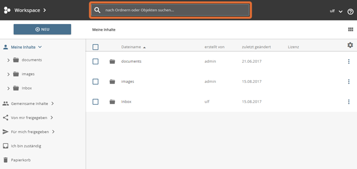 Für die Arbeit im Workspace existiert eine einfache Suche ohne erweiterte Suchfunktionen.
