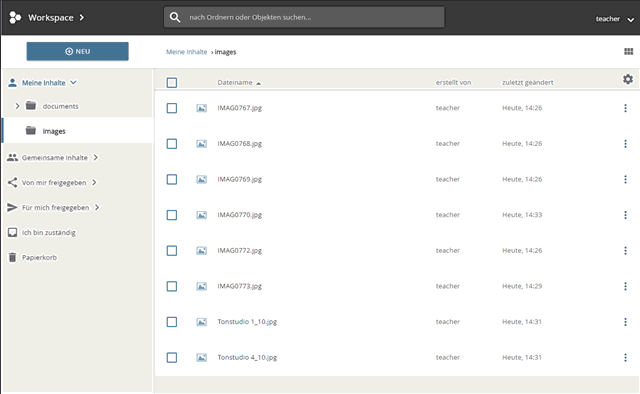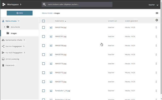 Wählen Sie im Inhalte-Bereich die zu bearbeitenden Ordner aus. Setzen Sie dafür ein Häkchen am Anfang der Zeile der gewünschten Ordner. Um alle Objekte des aktuellen Ordners auszuwählen, setzen Sie ein Häkchen im Feld links oberhalb des Inhalte-Bereiches. Klicken Sie auf die Schaltfläche „Löschen" im Menü oberhalb des Inhalte-Bereiches.