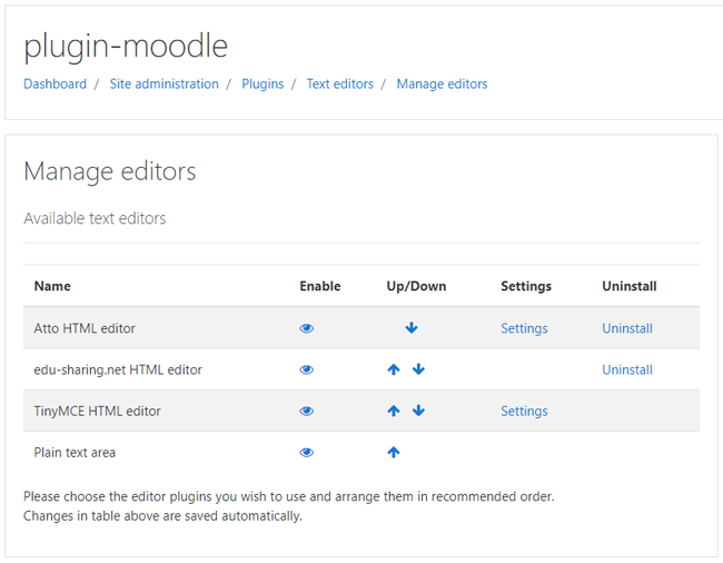 Activate the „Atto HTML editor" by clicking on the eye-button (enable); move it to the top of the list by means of the arrows (Up/Down).