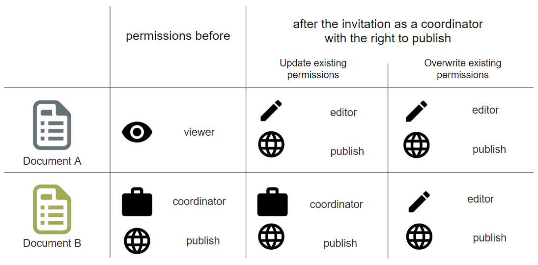 In this case, the already existing authorizations are supplemented by the new, higher authorizations. Higher permissions are not affected. - Overwrite existing permissions - The currently set permissions replace the existing permissions of the selected users/groups.