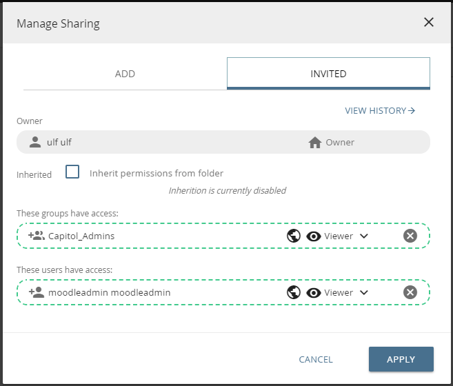 In order to check the assigned rights, switch to the "INVITED" tab of the view. All new permissions are surrounded by dashes.