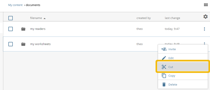 Select the folder you would like to move in the content pane. To do so move the mouse over the corresponding folder in the content pane. The button for the context menu will appear left of the name of the object. Users of mobile devices simply tap on the line of the folder in the Content area. Tap / click the button to access the context menu and select "cut".