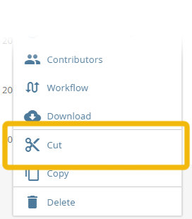 Select the item you would like to move in the content pane. To do so move the mouse over the corresponding object in the content pane. The button for the context menu will appear left of the name of the object. Users of mobile devices simply tap on the line of the object in the Content area. Tap / click the button to access the context menu and select "cut"