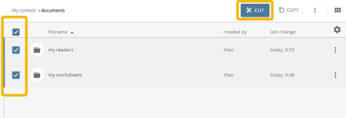 Select the desired objects in the content pane. To do so check the boxes on the left side of the corresponding rows. To select all objects in the current folder check the box above the content pane. Select the option “CUT”.