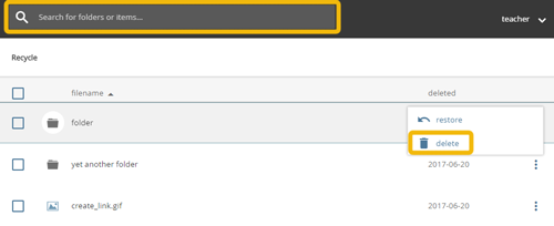 The recycle bin will open in the content pane. The search above the content pane helps you find the wanted objects.