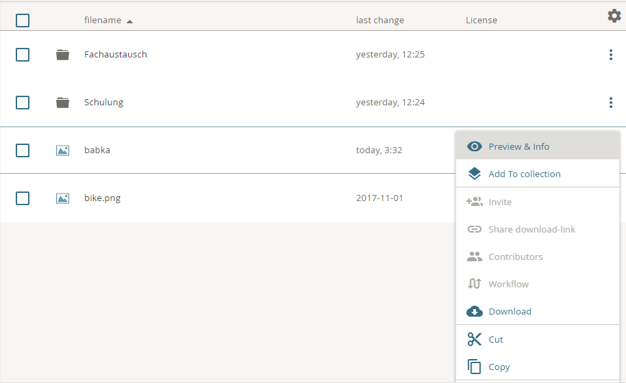 A special feature of the folder in the “shard content” area is that the access rights for the basic structure will usually be assigned by an administrator. That is why you may have fewer rights for folders and objects than in your private folders.