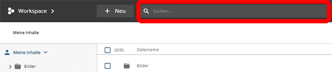 The search is located in the upper area of the workspace. With its help, you can search for content that has been stored in the repository in the Workspace view. Objects can be found faster than by navigating the content or navigation pane. The following documents and links are found when searching in the workspace: