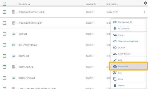 You are forwarded to the detail view of the object. In the upper part of the detail view you will find the "Download" button for downloading the object.