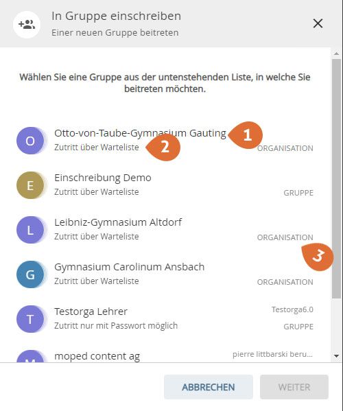 - Enrollment with waiting list: Users can enroll in the organization/group on their own and will be placed on a waiting list. An administrator must then confirm the enrollment.