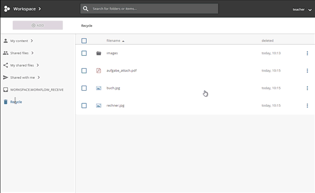 Open the recycle bin by clicking the corresponding node in the navigation area.