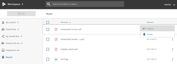 Check the desired objects in the recycle bin by clicking / tapping them and selecting the "RESTORE" option in the action pane of the workspace.