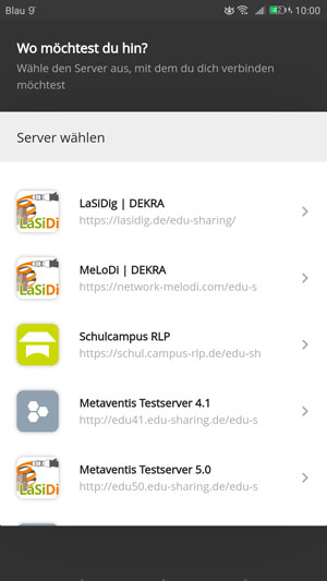 Wählen Sie aus den angezeigten Heimat-Repositorien ihren gewünschten aus. Sie können auch einen eigenen Server angeben (z.B. www.meineseite.de/edu-sharing). Sollten Sie die Adresse nicht kennen, fragen Sie Ihren Administrator.