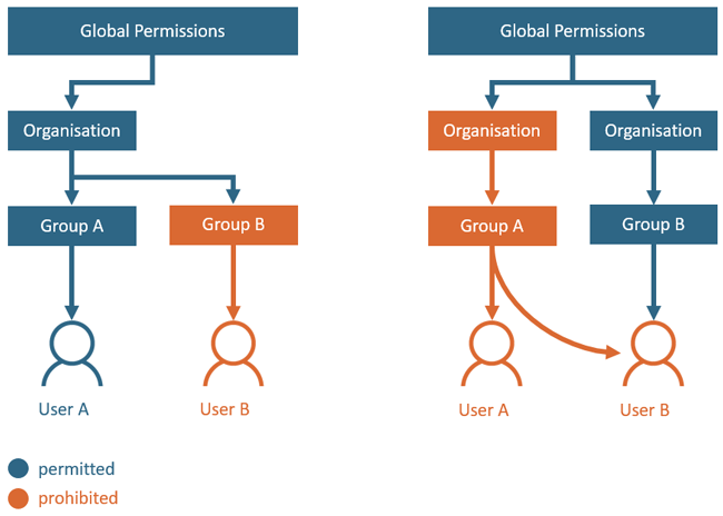 If a user is a member of two groups of which one group allows the use of a function, but the other group forbids the use of a function, he cannot use the function, since prohibitions always override permissions.