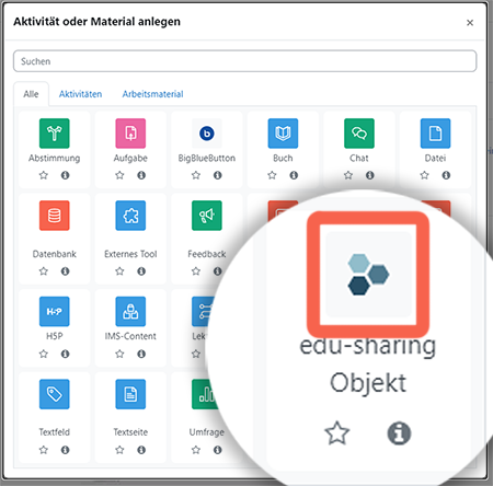 Nach der Integration des edu-sharing Repositoriums kann das Icon der edu-sharing Material-Option in der Übersicht "Aktivität oder Material anlegen" an Ihre Bedürfnisse beziehungsweise Ihr CD angepasst werden.