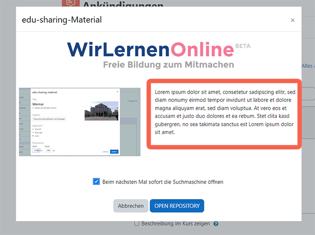 Bei der Verwendung der WYSIWYG-Integration für edu-sharing Objekte in Moodle erscheint beim ersten Aufruf ein Hinweis-Fenster mit einigen Informationen für Ihre Nutzenden, bevor die Repositorien-Suche geöffnet wird.