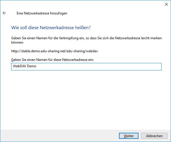 Saisissez l'adresse WebDAV (par ex. http://meinedomain/edu-sharing/) et cliquez sur "Suivant".