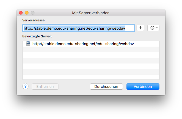 Pour connecter votre PC à edu-sharing, vous avez besoin de l'adresse WebDAV de votre système. Votre administrateur pourra certainement vous aider. Normalement, le chemin est à peu près le suivant : https://www.meine-adresse/edu-sharing/webdav (dans le cas de test, le chemin est http://www.meine-adresse/edu-sharing/webdav)