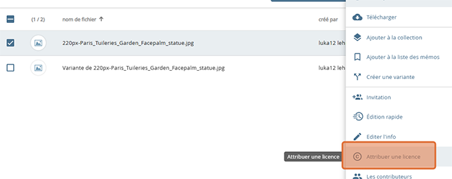 Dans l'espace de travail, la recherche ou la présentation détaillée, ouvrez le menu contextuel de l'objet souhaité. Sélectionnez ici l'option "Attribuer une licence".