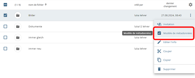 Sélectionnez l'option "Modèle de métadonnées" dans le menu déroulant d'un dossier.