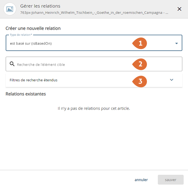 1. Sélectionnez le type de relation (basé sur, fait partie de, se réfère à).