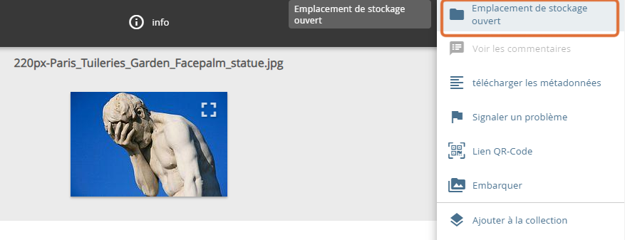 Pour accéder au dossier d'origine d'un objet trouvé, ouvrez le menu contextuel de l'objet (). Sélectionnez l'option « Avant-première et informations ».