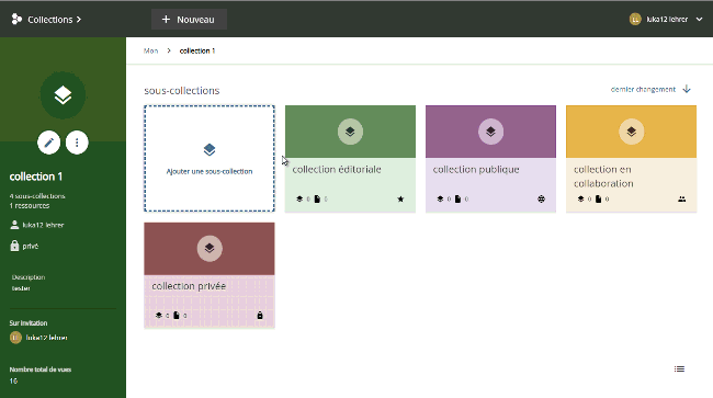 Collections (vlnr) : pour les utilisateurs invités / groupes, collection éditoriale, collection publique et une collection privée