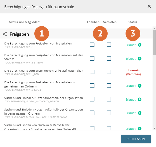 Nehmen Sie die gewünschten Änderungen durch das Setzen eines Häkchens für "Erlauben" vor. Die Berechtigung wird in Echtzeit vergeben und der Status aktualisiert.