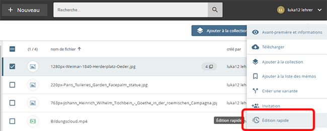 L'outil "Édition rapide" est accessible depuis l'espace de travail, la recherche et la présentation détaillée des objets. Il apparaît ici dans le menu déroulant conformément à la configuration du système.