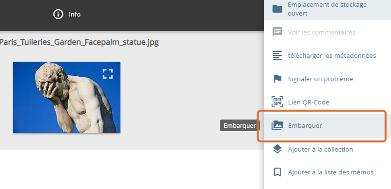 Le code d'intégration des objets est accessible dans la liste détaillée. Dans le menu contextuel, vous trouverez l'option « Embarquer».
