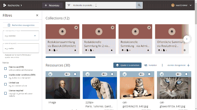 Le moteur de recherche edu-sharing offre les fonctions les plus étendues. L'utilisateur dispose ici de fonctions de recherche avancées. La recherche edu-sharing peut par exemple être intégrée dans le site web des organisation utilisatrices en tant que recherche publique OER.