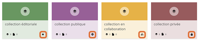 Collections (vlnr) : pour les utilisateurs invités / groupes, collection éditoriale, collection publique et une collection privée